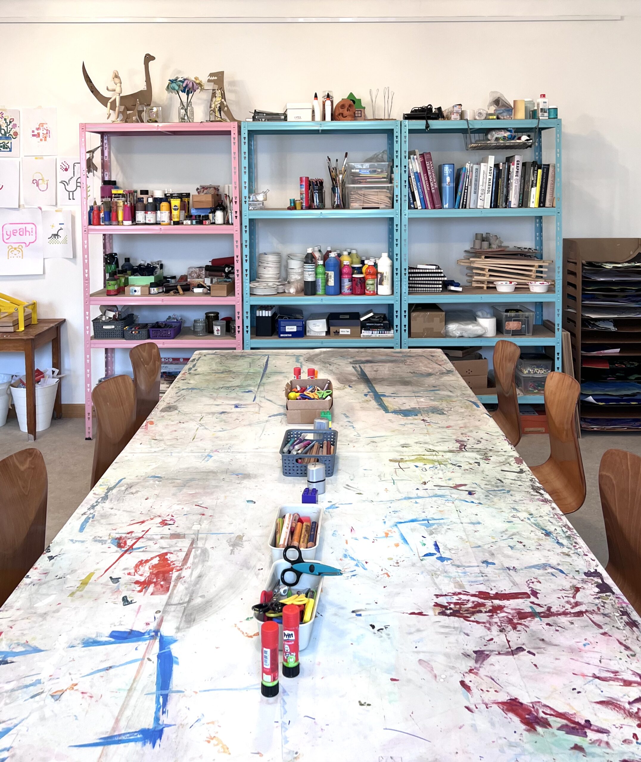 Drucken, Klecksen, Kleben, Zeichnen, Tonarbeiten, Pinseln, Erforschen, Schneiden, Malen, Filmen, Kneten, Erfinden, Formen, Gestalten, Stempeln, … und was dir sonst noch einfällt!
