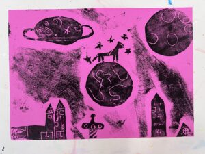 Bei dieser Hochdrucktechnik– ähnlich dem Holzschnitt- gestalten die Kinder ihre Stempel. Der Kreativität sind nahezu keine Grenzen gesetzt und die kleinen KünstlerInnen können viele bunte Abzüge ihres Bildes machen und anschließend verschenken oder mit nach Hause nehmen.